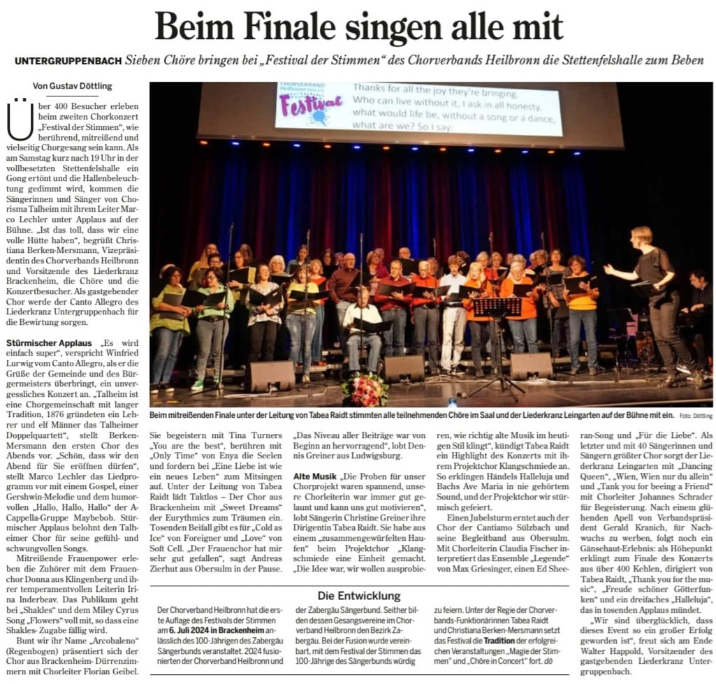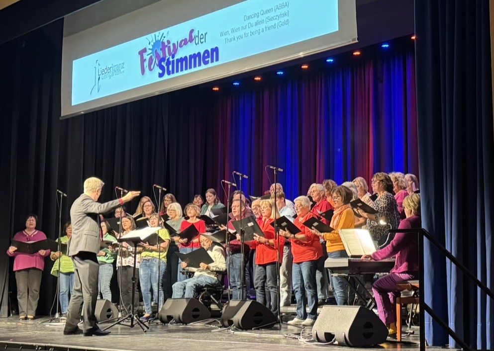 Ein bisschen war es wie beim Eurovision Song Contest. Nacheinander kamen sieben Chöre auf die Bühne und haben mit jeweils 3 Stücken aus ihrem Repertoire das Publikum bestens unterhalten. Als es dann hieß „This ist Leingarten Calling“ durfte der Liederkranz als letzter Chor den Abend beschließen. Mit rund 40 Aktiven auf der Bühne begeisterten wir das Publikum mit drei ganz unterschiedlichen Diamanten aus der Welt der Chor-Melodien – in Form geschliffen von unserem Chorleiter Johannes Schrader und begleitet am Piano von Kirstin Schrader. Zuerst nahmen wir das Publikum mit in die gemütliche Wärme der Fernsehklassiker - mit dem Titel „Thank You For Being a Friend“ aus der amerikanischen Serie „Golden Girls“ – gleichzeitig ein kleiner Vorgeschmack auf unser Konzert „Hits aus der Flimmerkiste“ am 13. Juni 2026. Danach schwangen wir elegant über das Parkett mit einem Walzer, der Wien in all seiner Pracht besingt, „Wien, Wien nur Du allein“. Und zum großen Finale ließen wir die Discokugel funkeln und rundeten den Abend mit ABBAs „Dancing Queen“ ab.